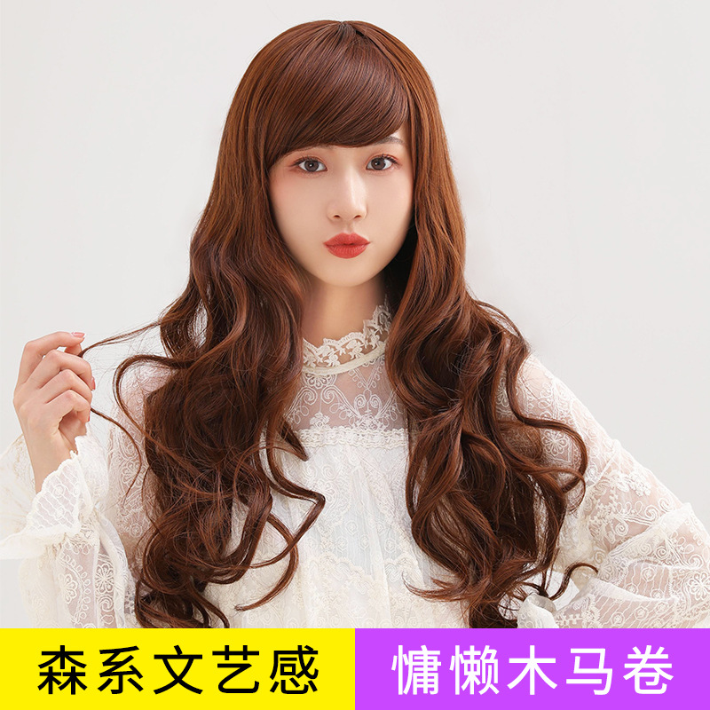 かつらの女性の長い髪のネットの赤い波のカールのリアルな斜めの前髪の美しい顔の丸い顔のかわいい韓国式の全体のトップのカバー