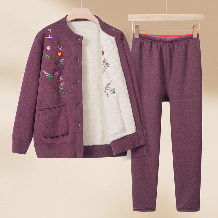 おばあさんの秋冬の新型のスーツの女性のお年寄りの保温の2つのセットのお母さんの洋風のベルベットの厚いコートのおばあさん