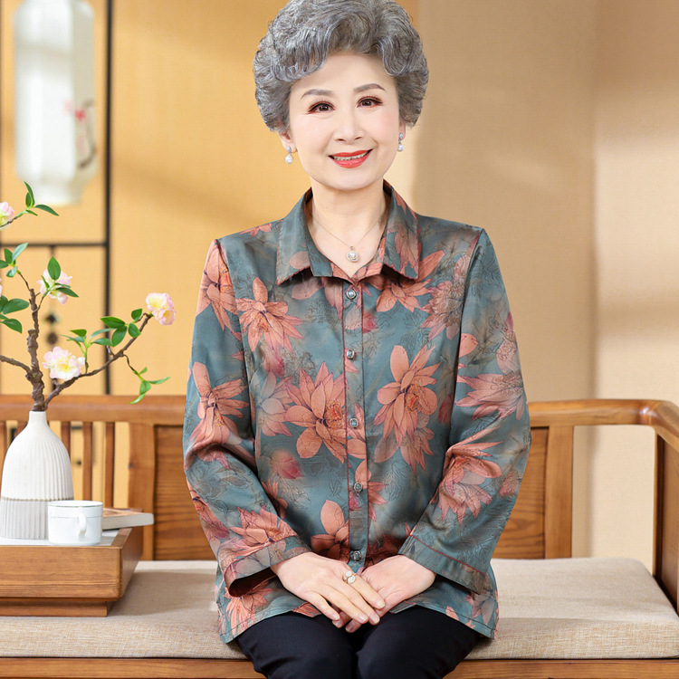 お母さんの新しい春・秋用シャツ、おばあちゃんの花柄トップス、中高年女性用シャツ、高齢者向け服