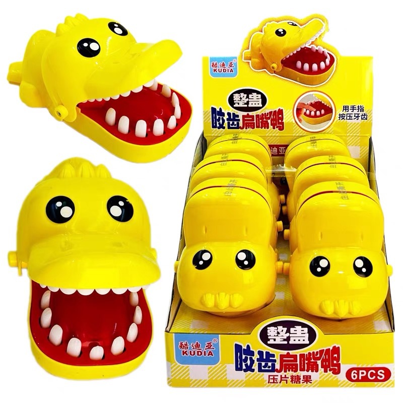 ネットの赤い爆発の子供の親子はキャンディーのおもちゃをして指の大きい口をかむワニのアヒルは歯を抜いて手をかむ