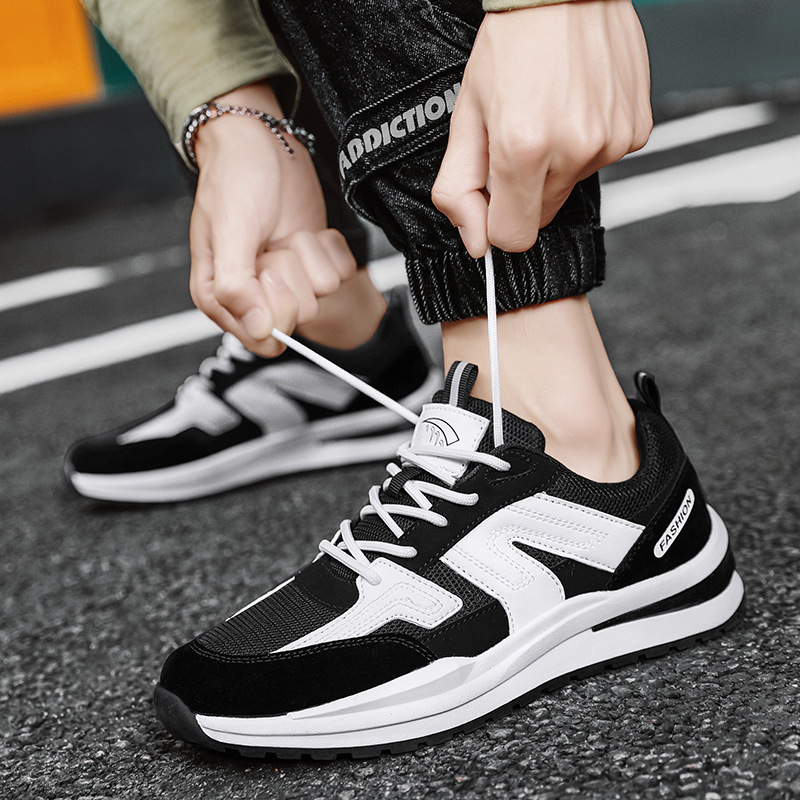 メンズトレンディな春と秋のレトロカジュアルジョギングシューズ厚底軽量フライ織り通気性と耐摩耗性の若者向けスポーツシューズ