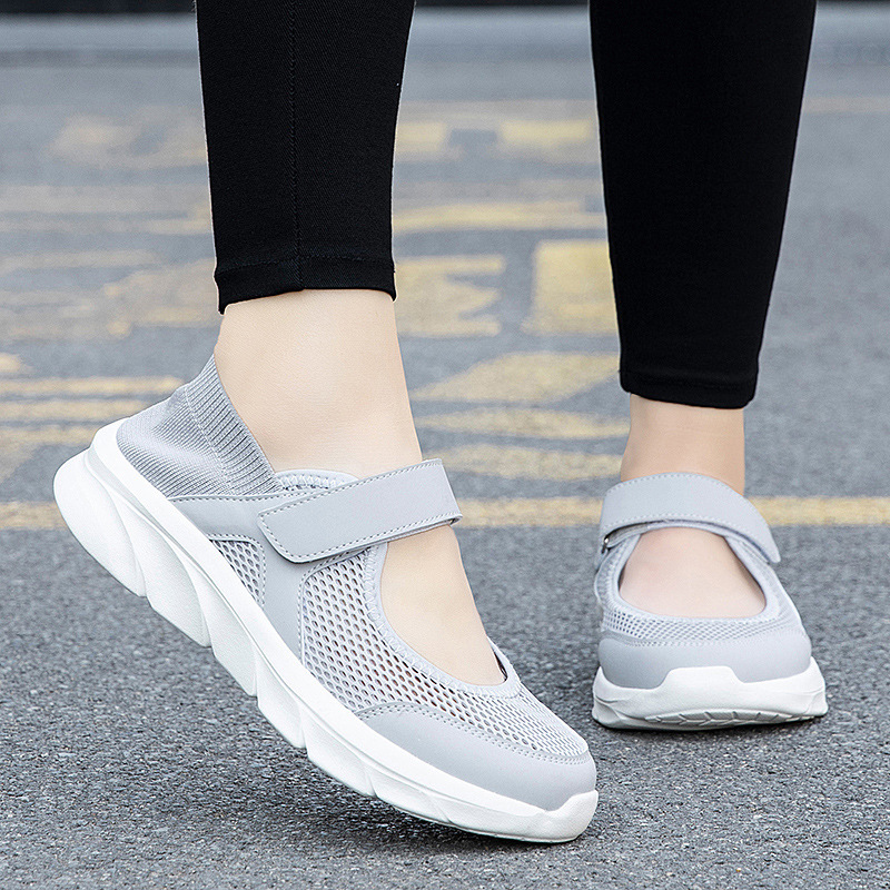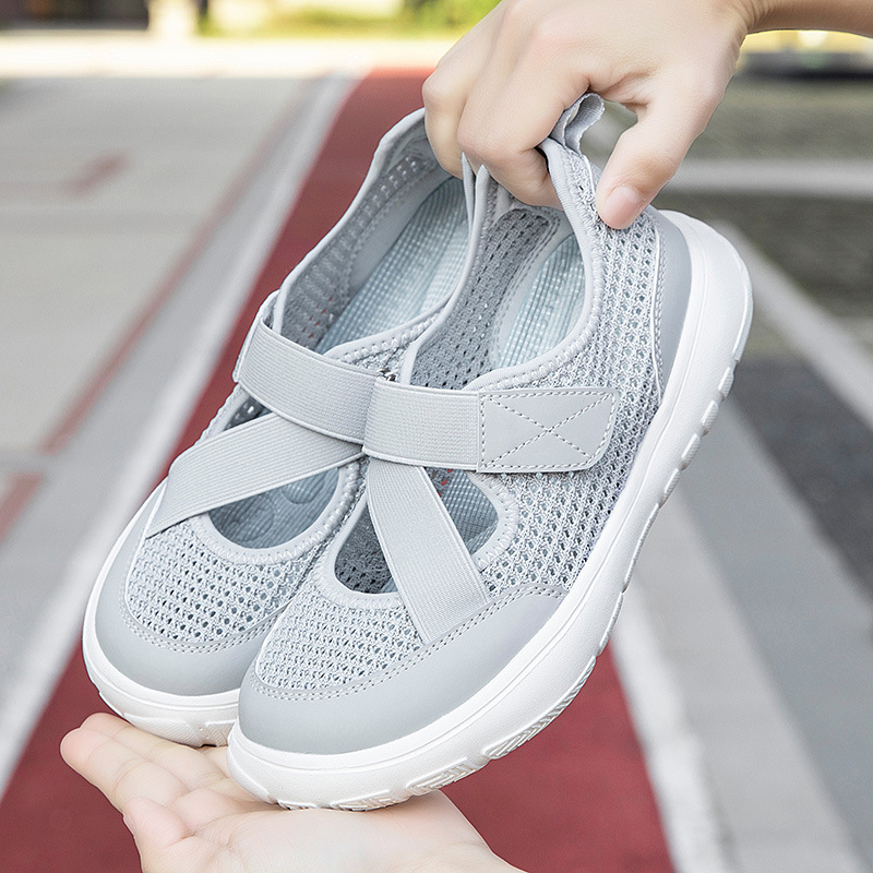 古い北京布靴、女性の夏の通気性のある高齢者の靴、柔らかい靴底、中高年の母親のための快適な厚底メッシュスポーツサンダル