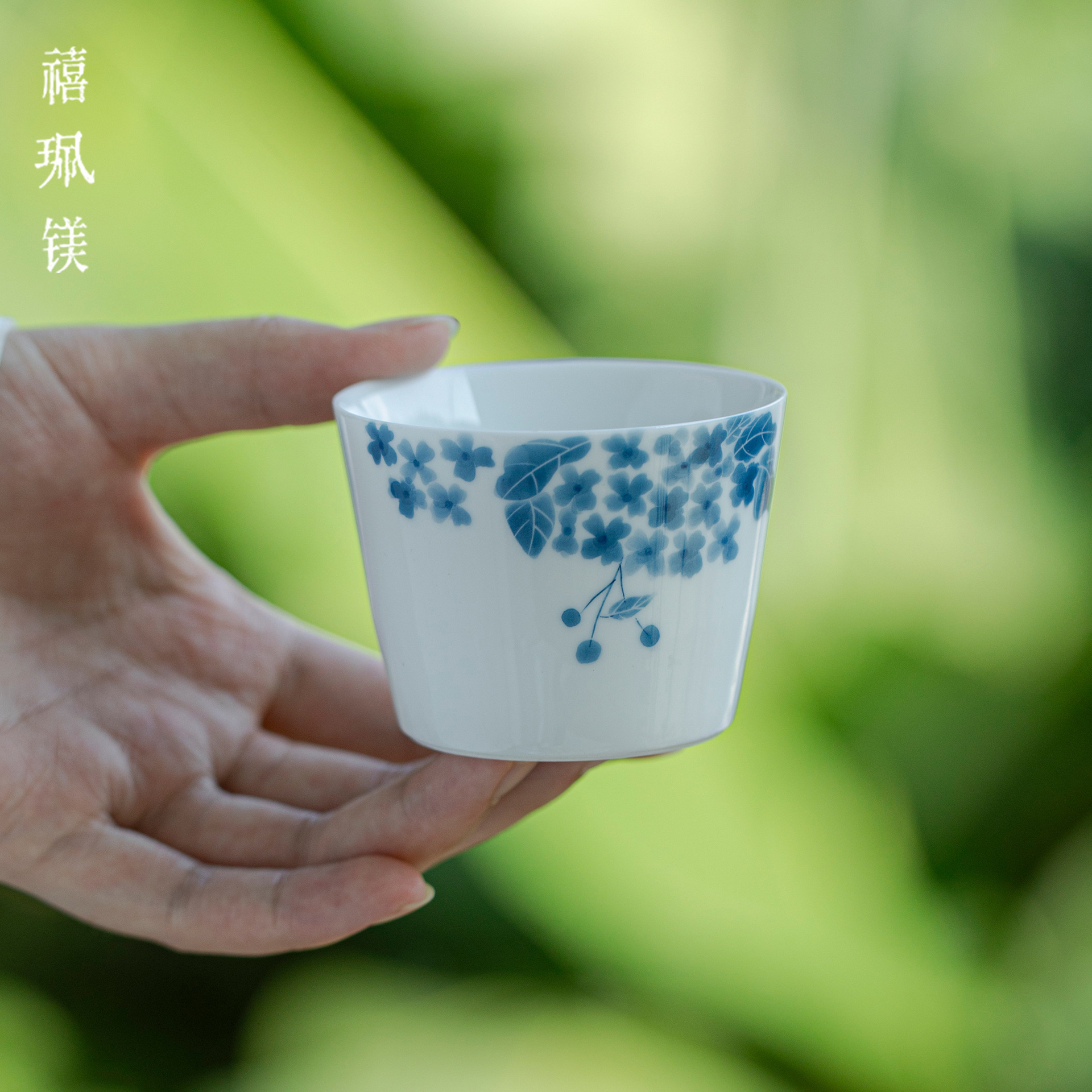 禧マグネシウム甘白青花手描き主人杯日本式家庭用個人大容量お茶カップ白磁陶磁器カップ