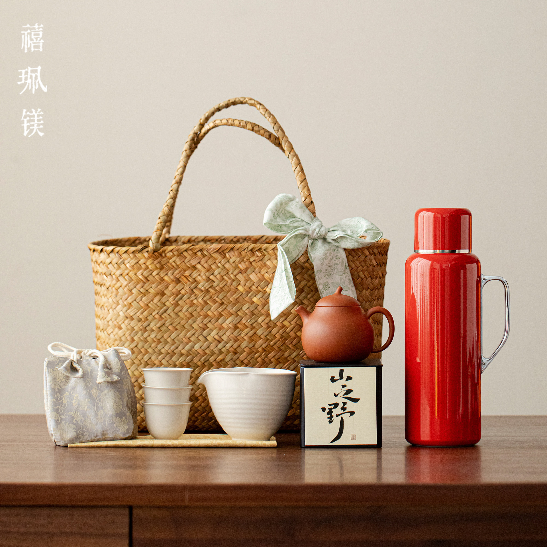 禧マグネシウム旅行茶器蒸茶ティーポット女性茶器杯紫砂壺屋外携帯藤編手提げかごカバー
