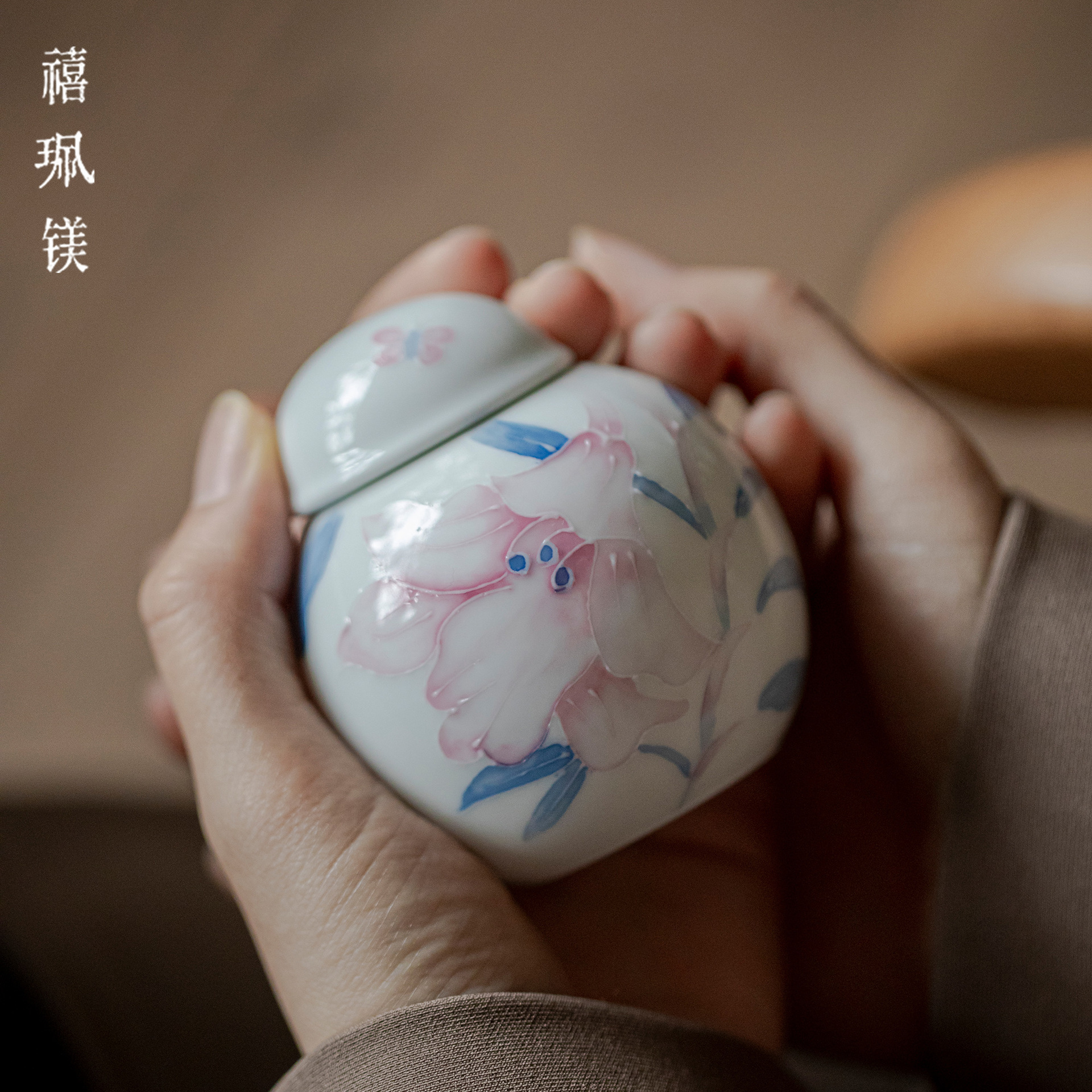 墨己玉泥有田焼百合陶磁器茶葉缶トランペット密封茶葉貯蔵缶携帯ミニ密封缶