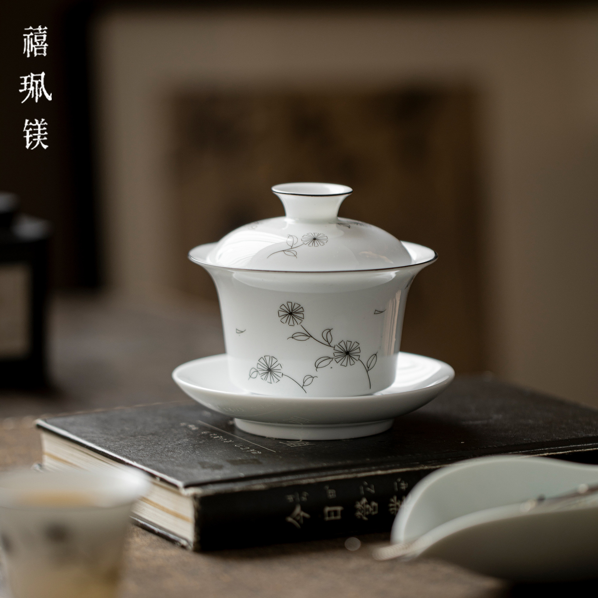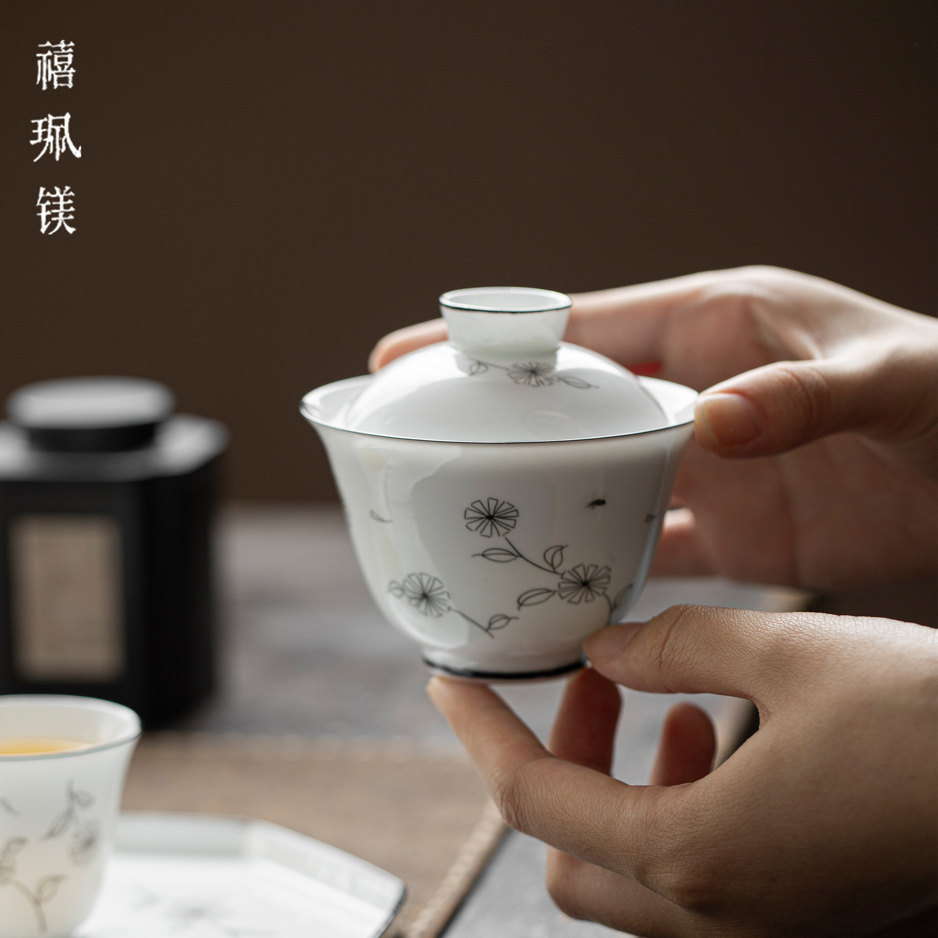 禧マグネシウム玉泥スケッチデイジー手描き工夫茶器陶磁器三才蓋茶碗家庭用手を温めずお茶茶碗