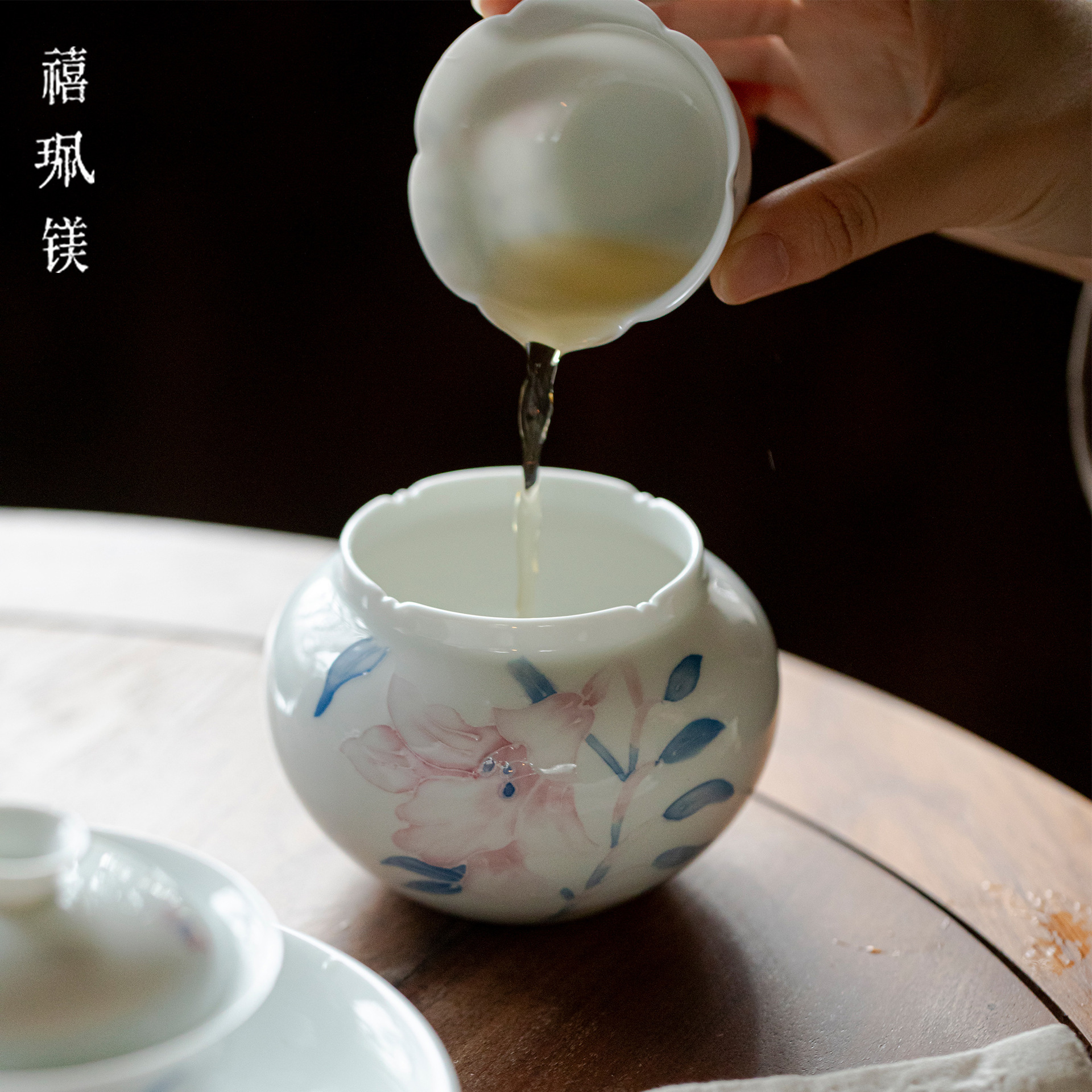 禧マグネシウム玉泥白磁手描き百合花廃水筒茶道部品陶磁器建水家庭用トランペット水孟
