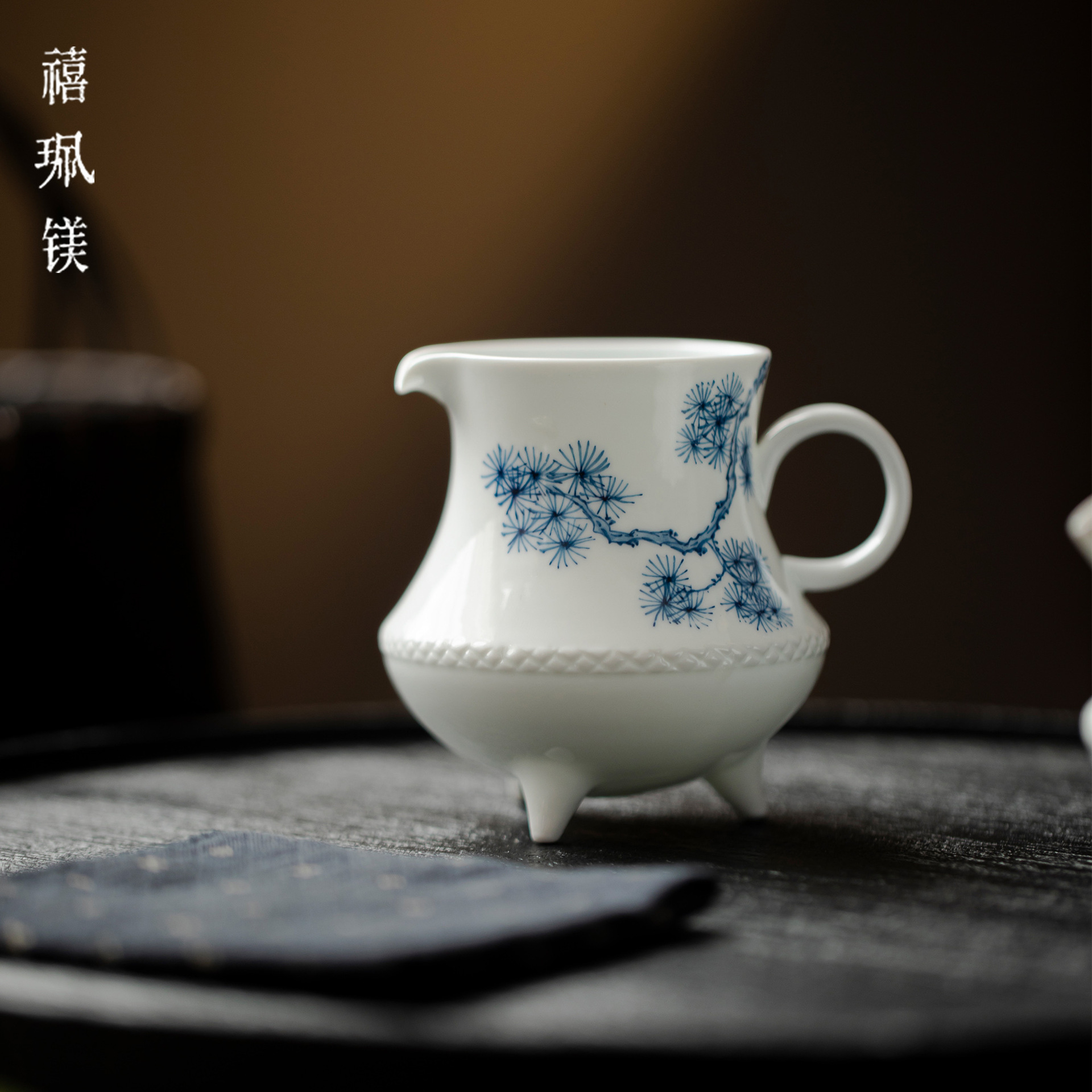 禧珮镁玉泥手绘松峰陶瓷三足鼎公道杯功夫茶具家用复古茶海分茶器