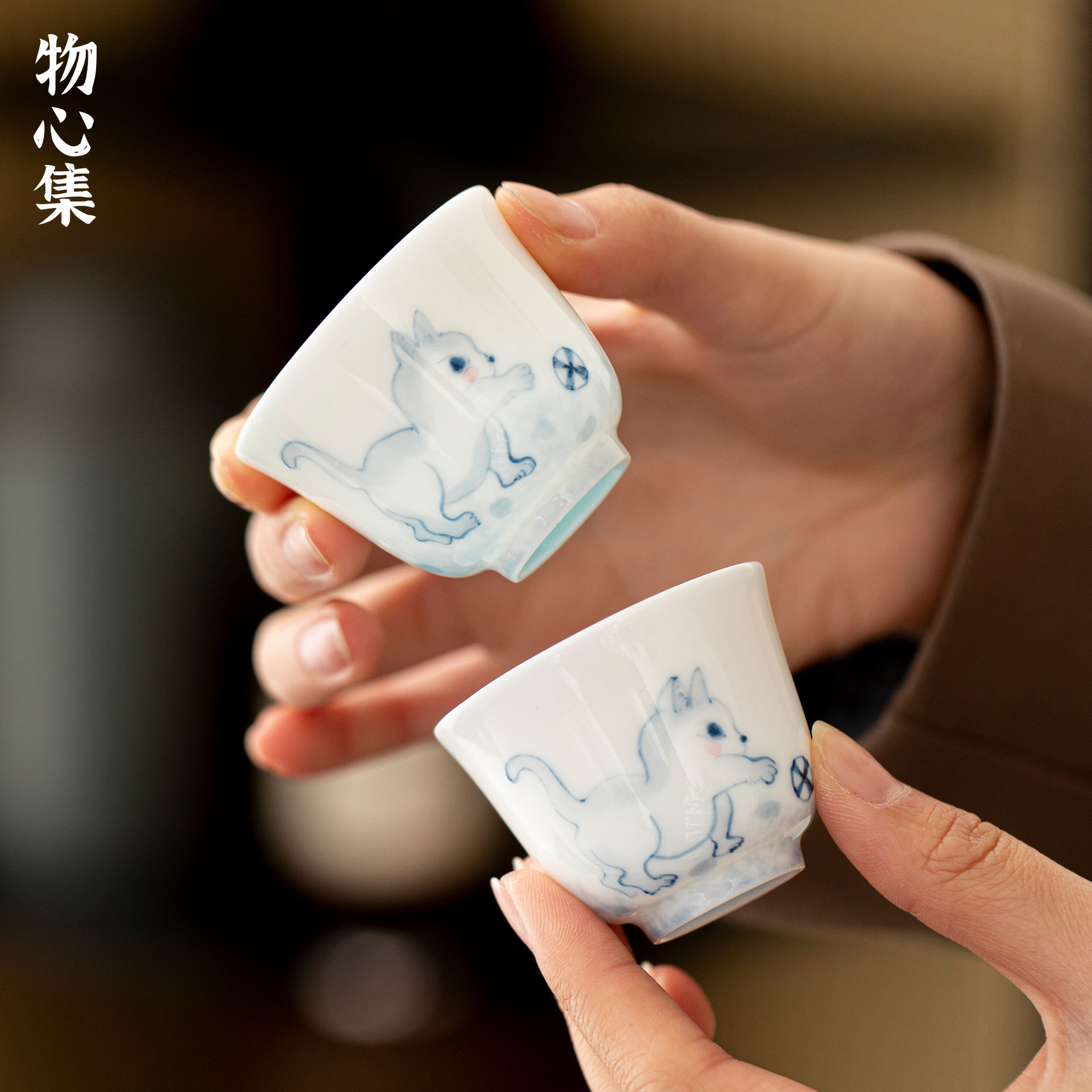 物心集玉泥青花手描きかわいい猫品茗杯文人女性主人杯陶磁器工夫カップ