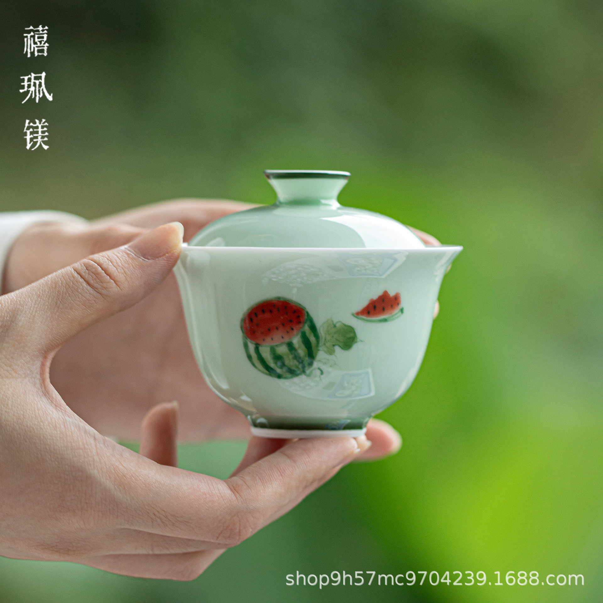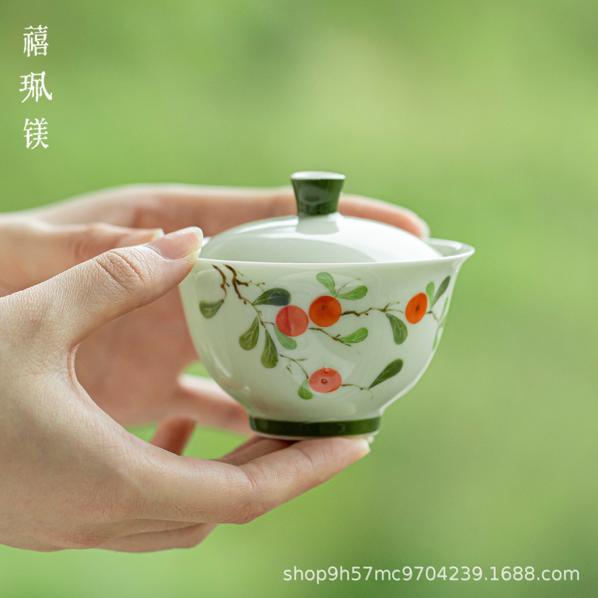 禧マグネシウム蓋碗果青釉薬下彩手描き楊梅二才蓋付き茶器家庭用アイロンなし手で茶碗をつかむ