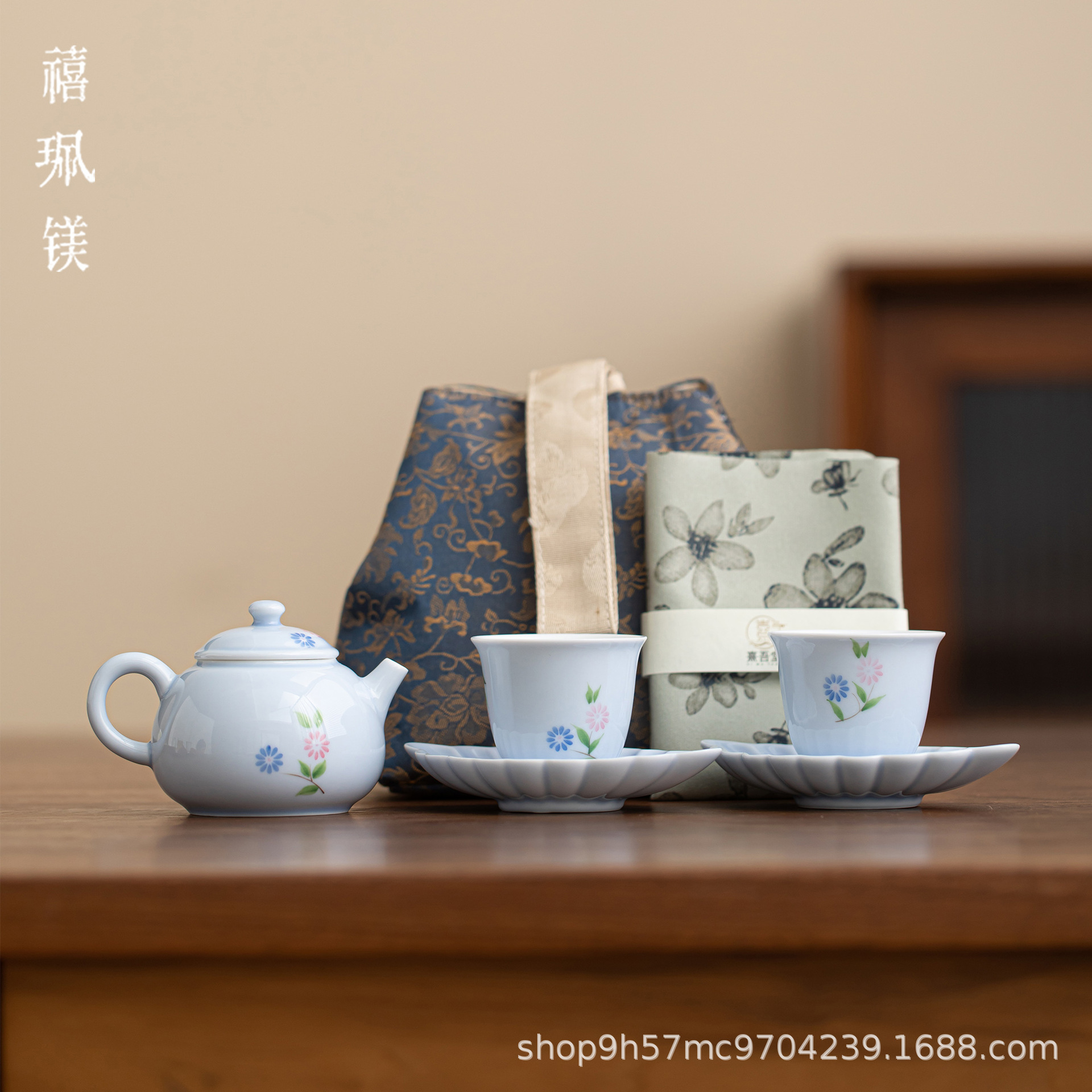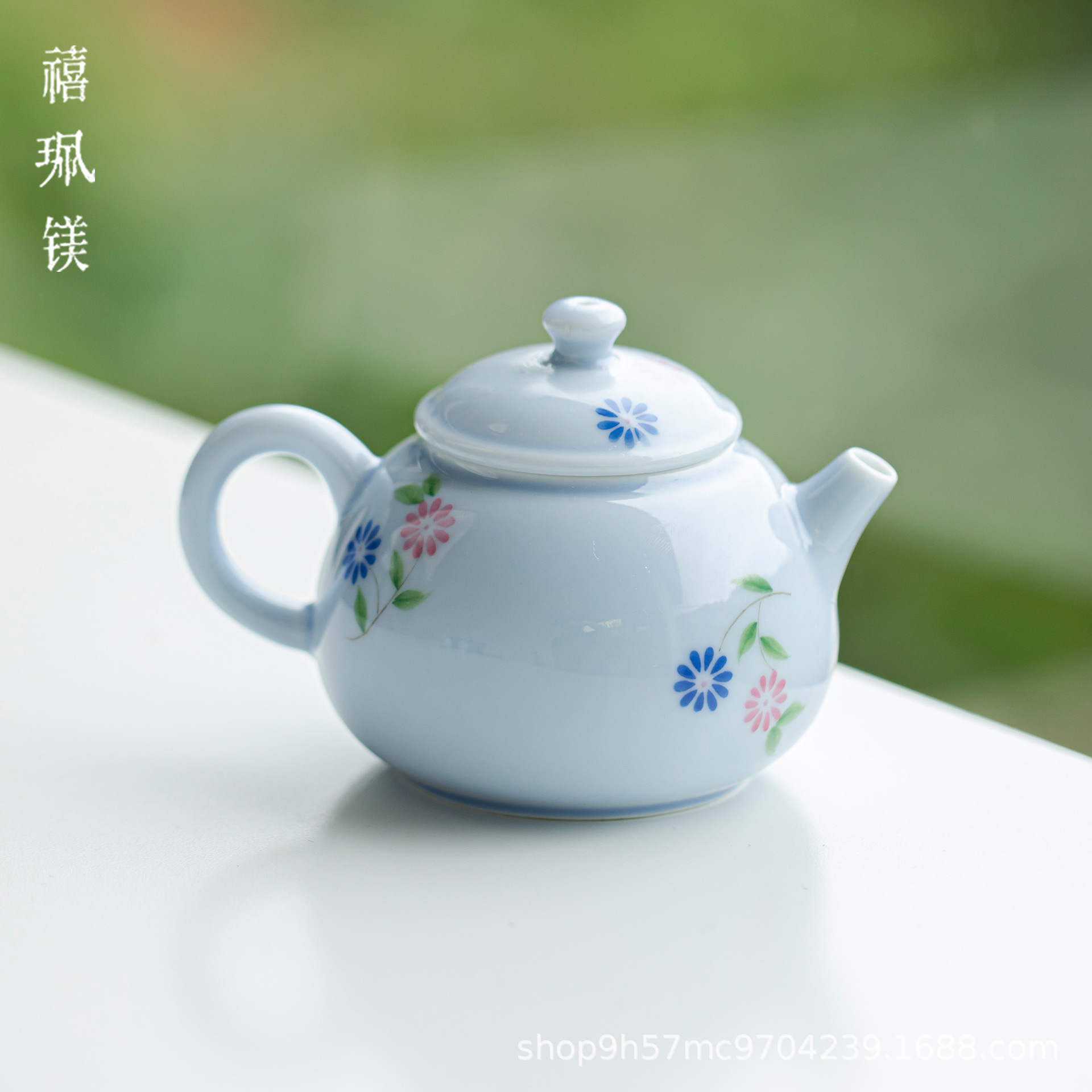 禧マグネシウムティーポット浅青手描きデイジー陶磁器泡茶器小容量個人単壺貴妃壺カンフー茶器