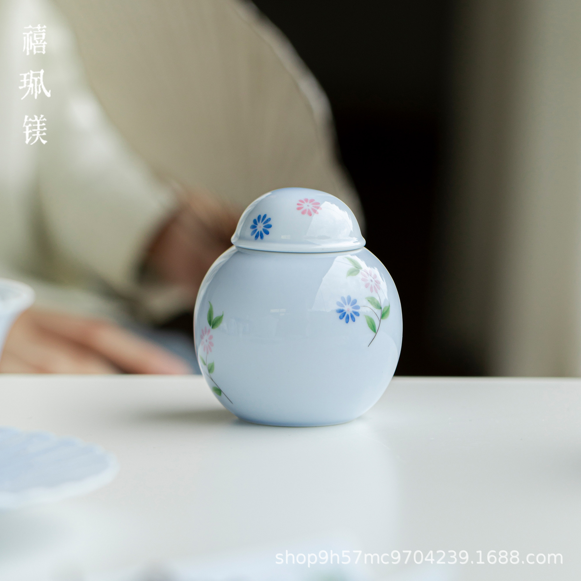 禧マグネシウム茶葉缶浅青手描き小デイジートランペット陶磁器茶葉密封缶はいつでもミニ保存缶