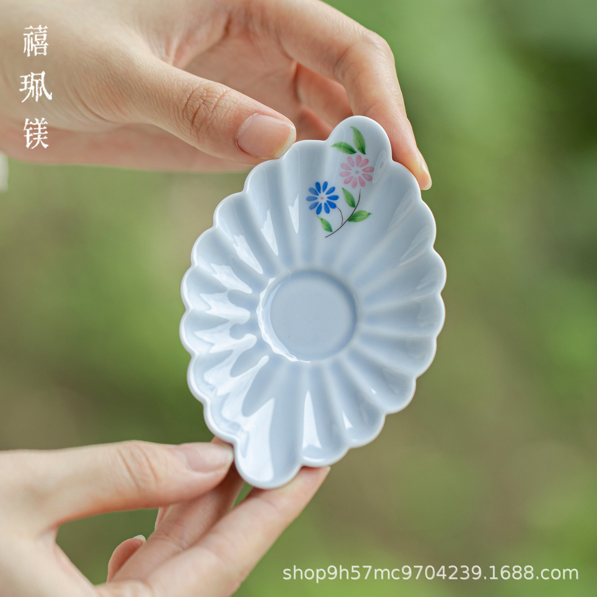 禧マグネシウムカップマット浅青釉薬下彩手描き小デイジー菊弁茶托工夫茶器陶磁器カップマット断熱