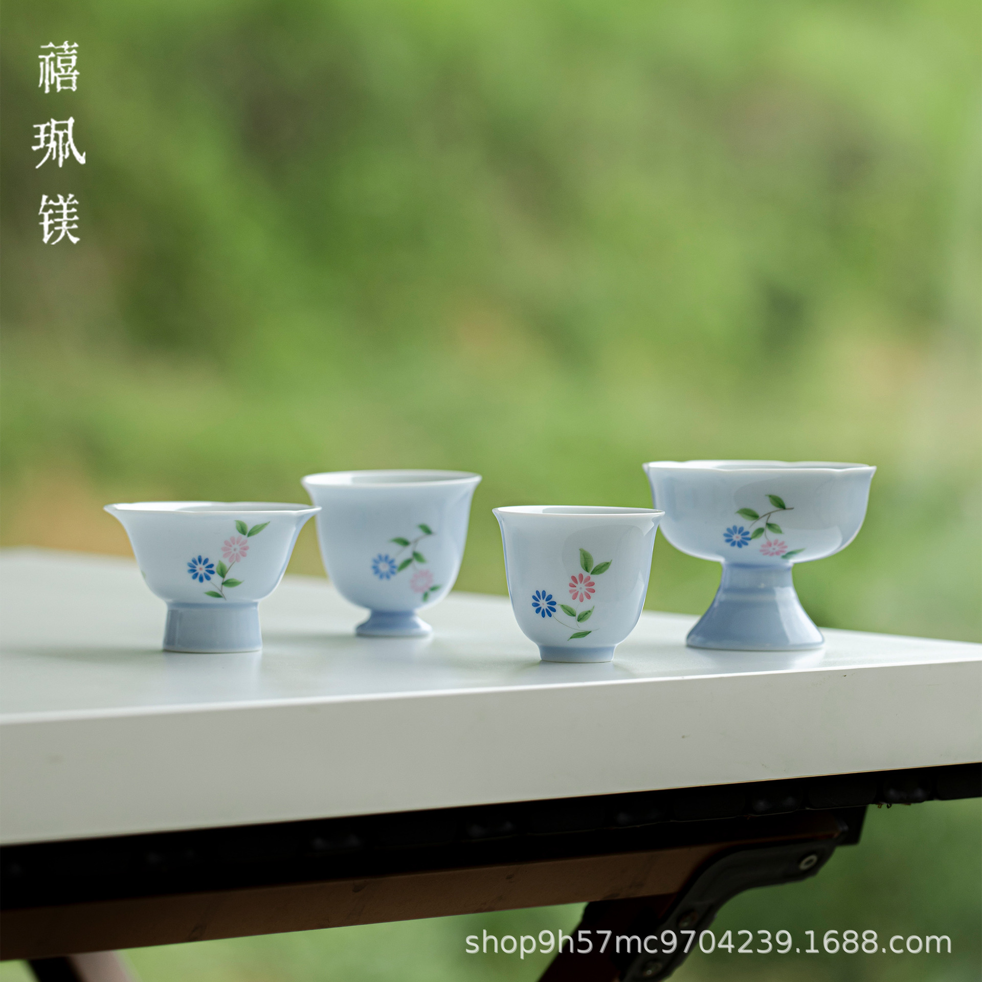 禧マグネシウム浅青釉薬下彩手描き小デイジー高足品茗杯花口杯小清新個人カップカップ