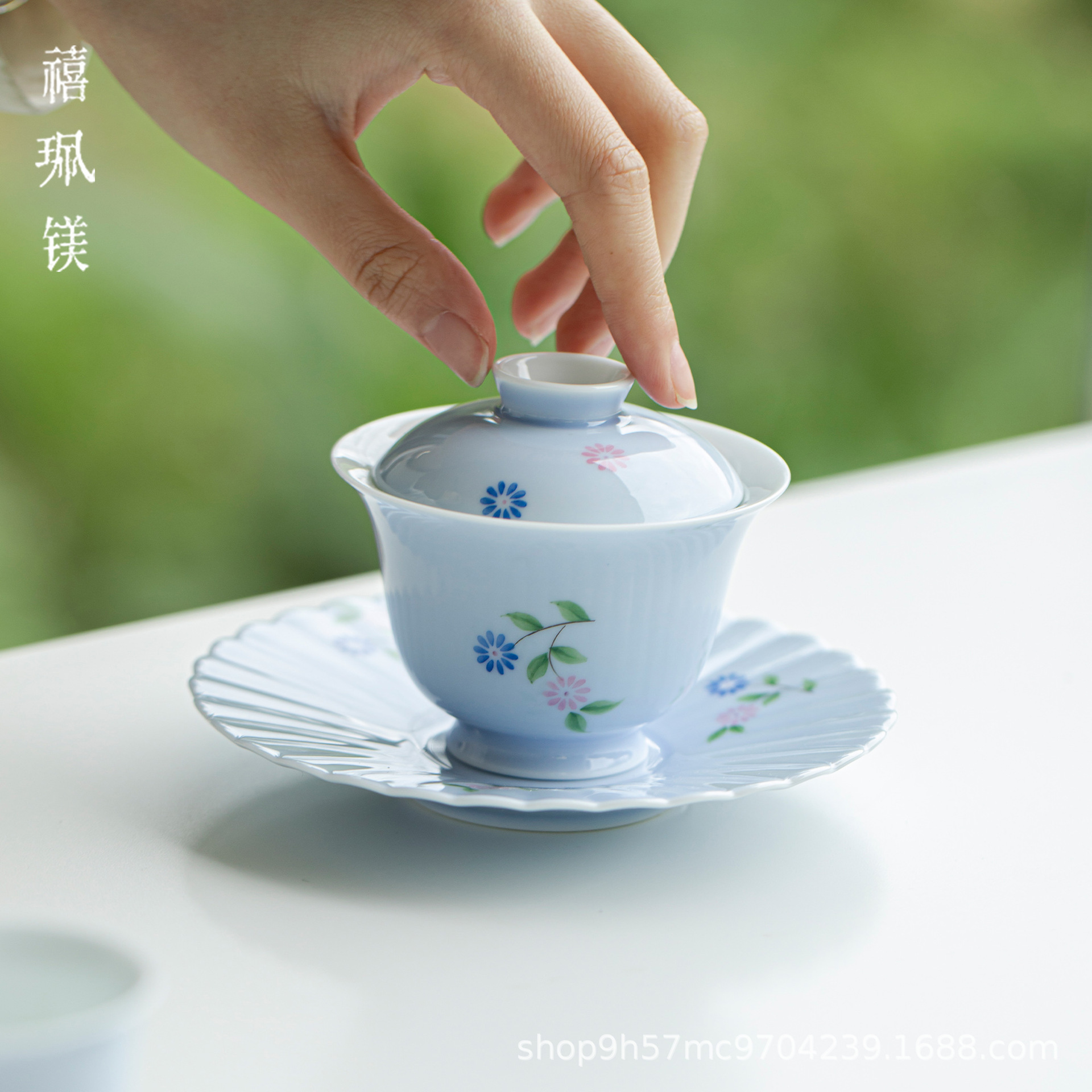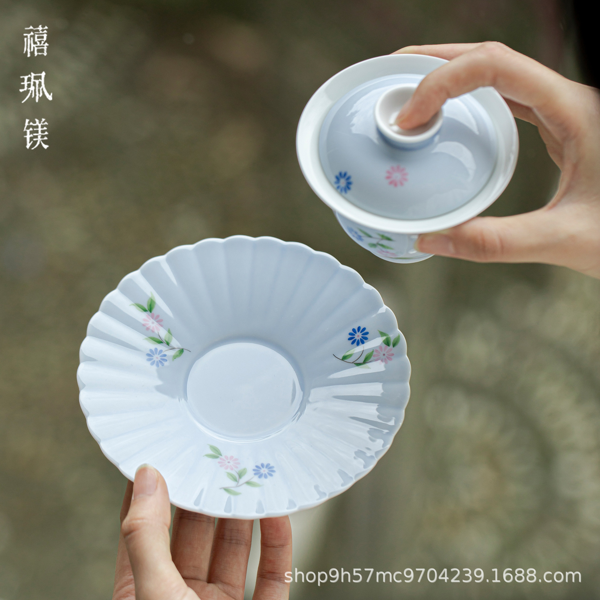 禧マグネシウム蓋碗浅藍手描き小菊蓋付茶器家庭用陶磁器胎薄無熱手高足茶碗