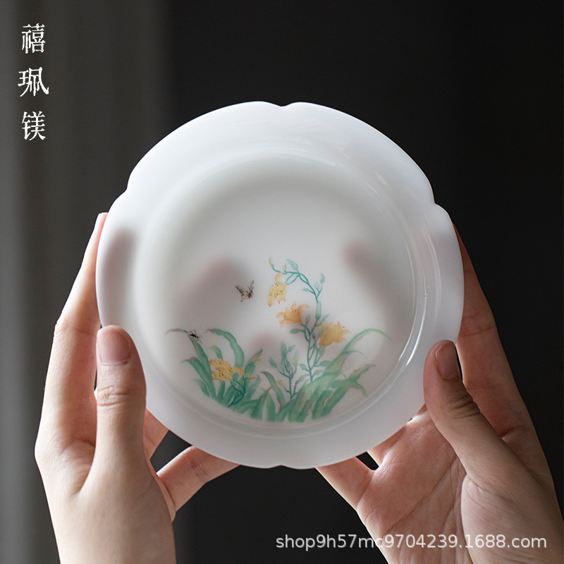 禧マグネシウム氷種玉磁器手描き花口壺承花開乾泡茶器部品白磁茶托茶盤壺托