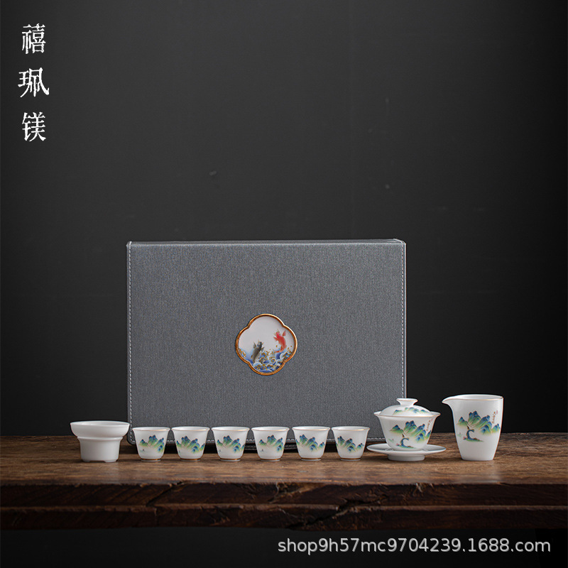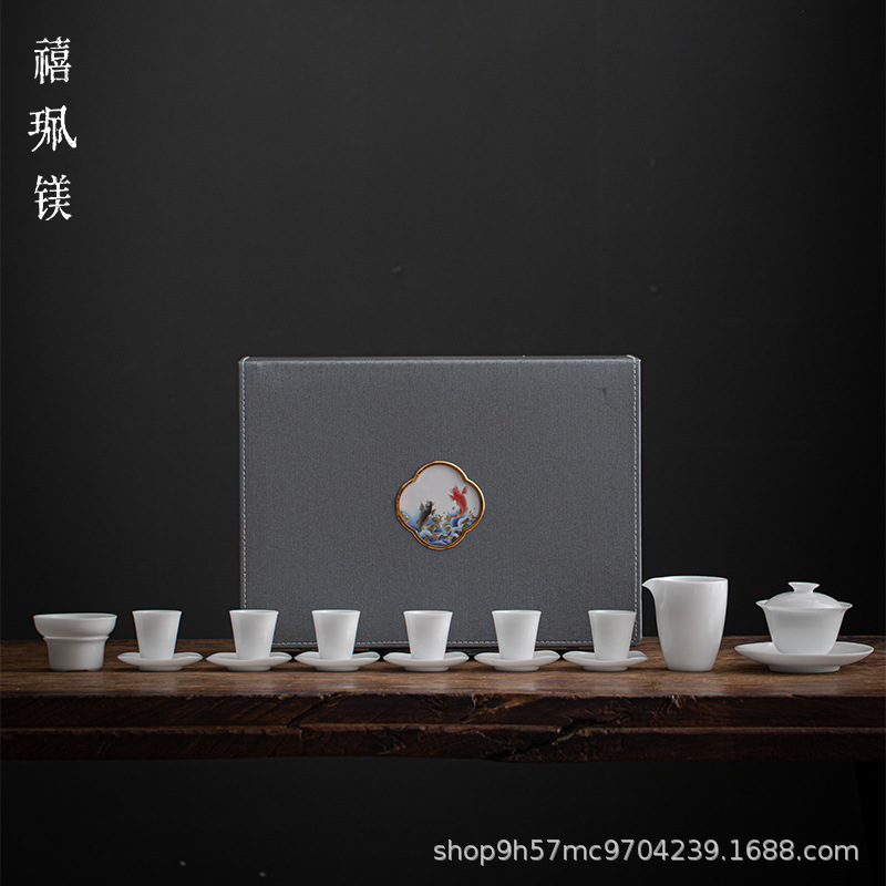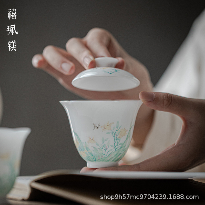禧マグネシウム手描き羊脂玉白磁器セット工夫茶器蓋碗家庭用ティーカップ茶漏れ軽高級セット
