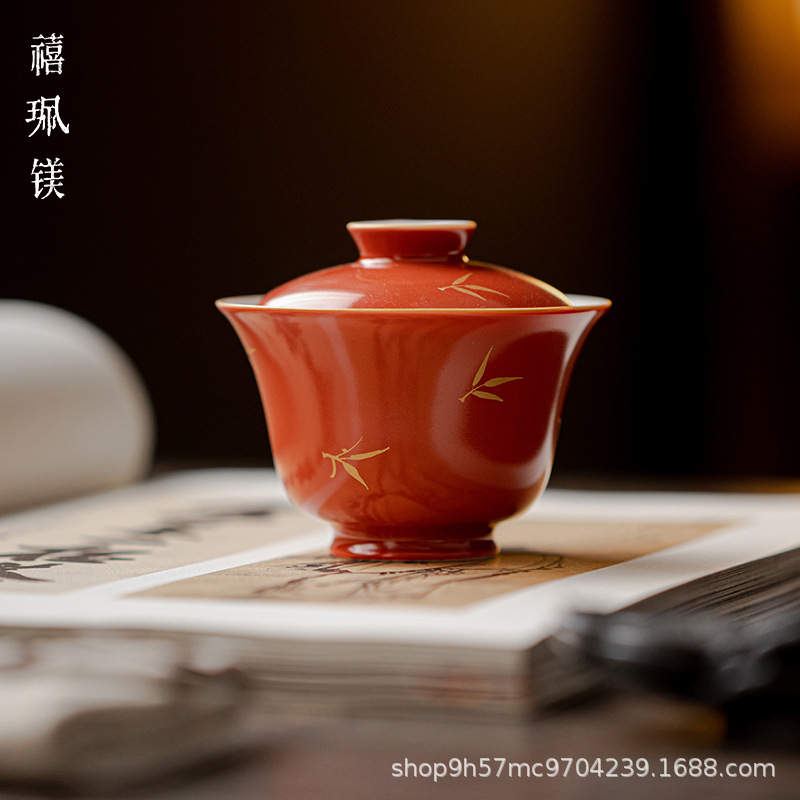 禧のマグネシウムのサンゴの赤い純粋な手描きの蓋の碗は金を塗ってお茶の碗の湯飲みを入れません。