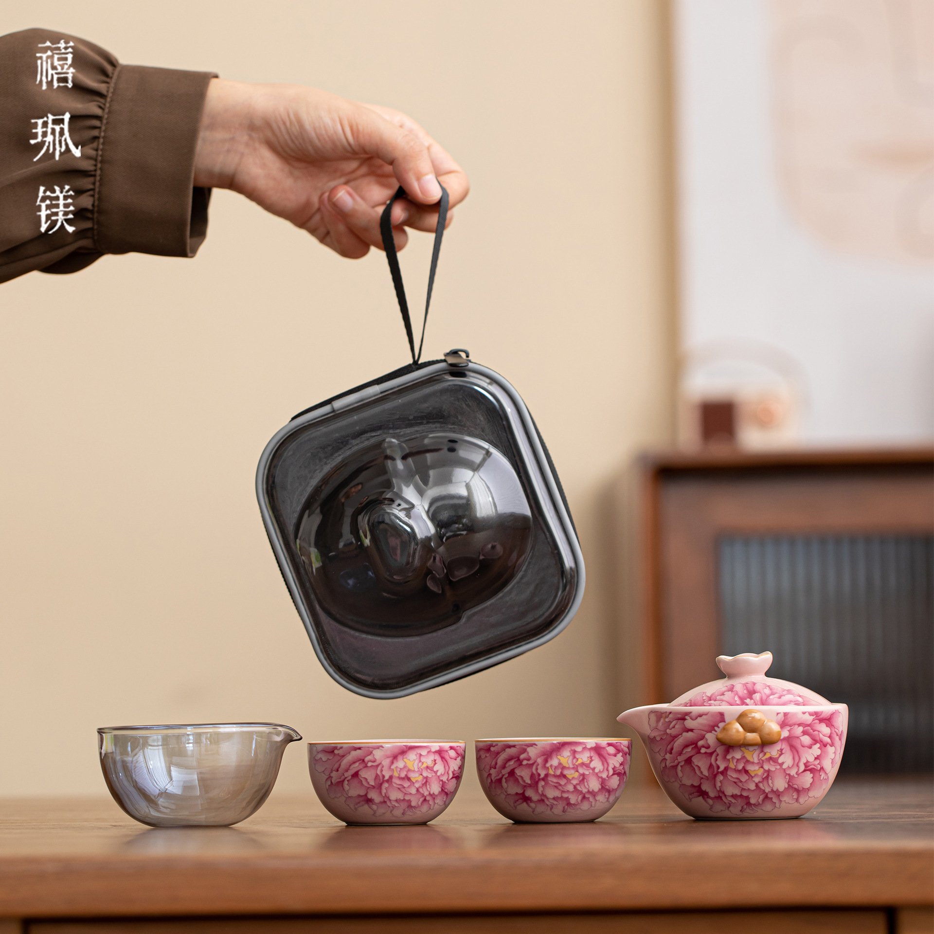 禧マグネシウムピンク汝窯牡丹快客杯陶磁器は一壺二杯の屋外携帯旅行茶器を開くことができます。