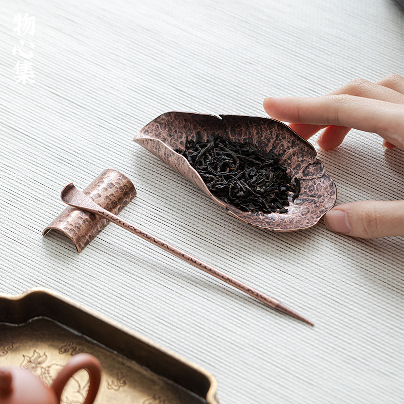 Wuxinji アンティーク銅茶セット 3 点セット銅メッキ槌目蓮の葉茶スプーン茶針茶枕カンフー茶セットスペアパーツ