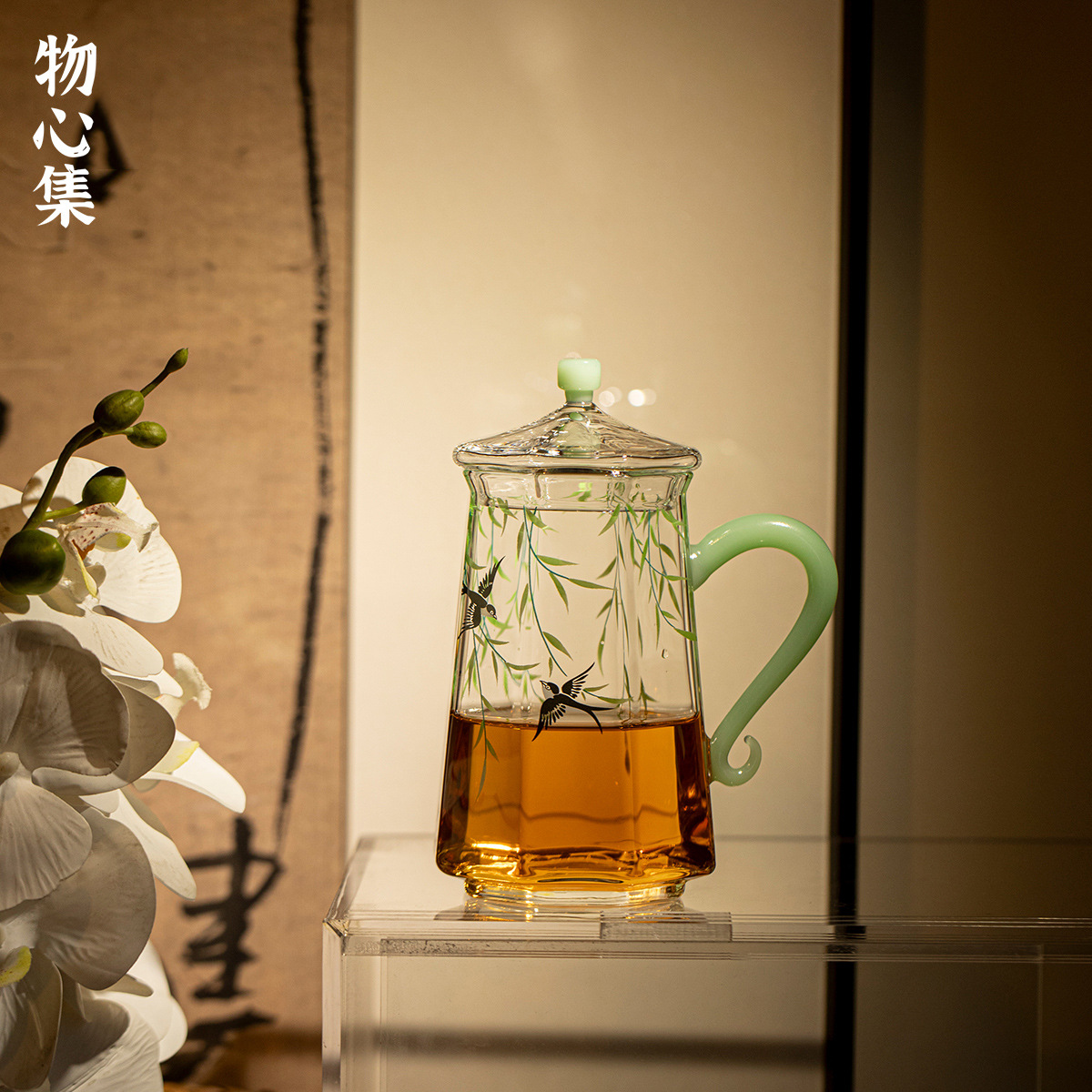 Wuxinji 耐熱ガラス大型ティーカップ蓋付きオフィスグリーンアンバーハンドウォーターカップ高ホウケイ酸フラワーティーカップ