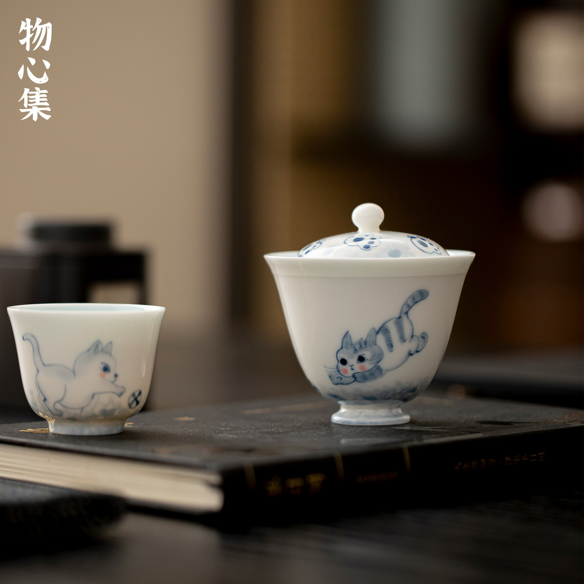 物心集玉泥青花手描きかわいい猫陶磁器蓋椀小清新二才茶器を入れて手茶碗を温めない