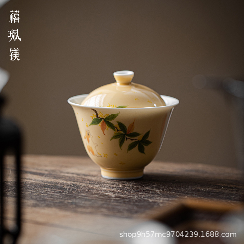 禧マグネシウム杏黄釉薬下彩手描き蓋碗手作り陶磁器家庭用泡茶碗カップ白磁工夫茶器