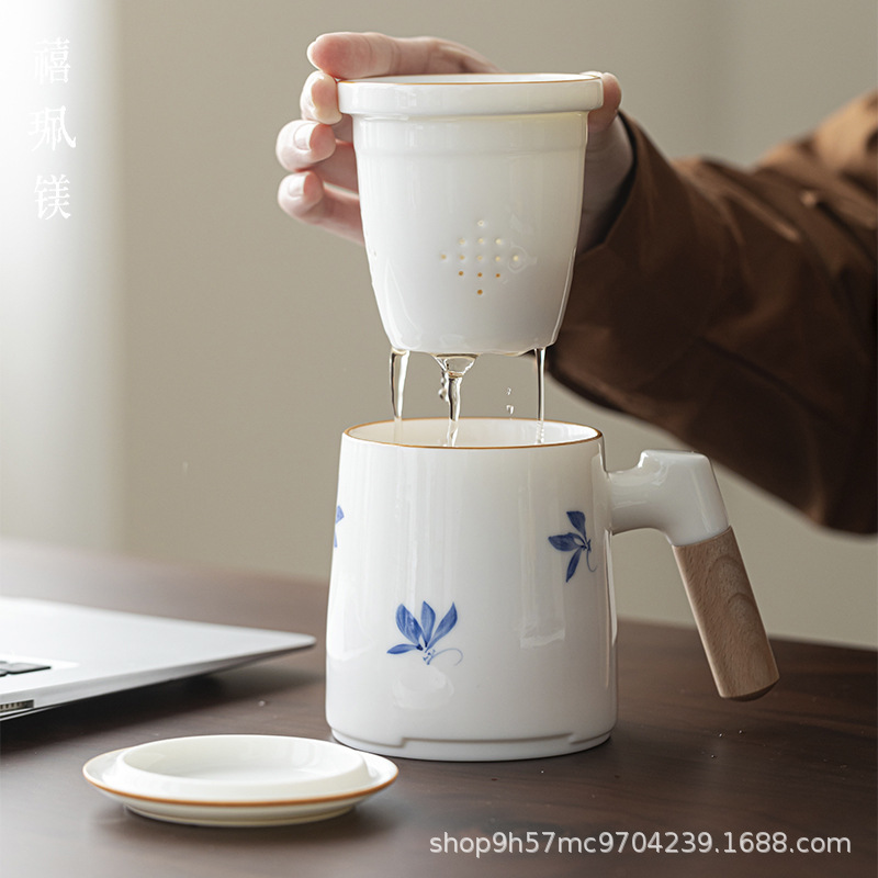 禧のマグネシウムのマグカップの手描きの蘭の白い磁器は蓋を持って濾過してお茶を入れます。