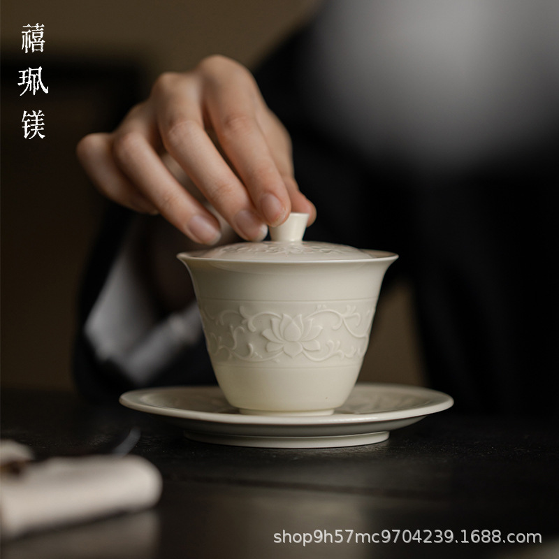 禧マグネシウム定窯黄手作業レリーフ三才蓋碗日本式レトロ家庭用蓋付きお茶を入れる工夫茶器お茶を飲む