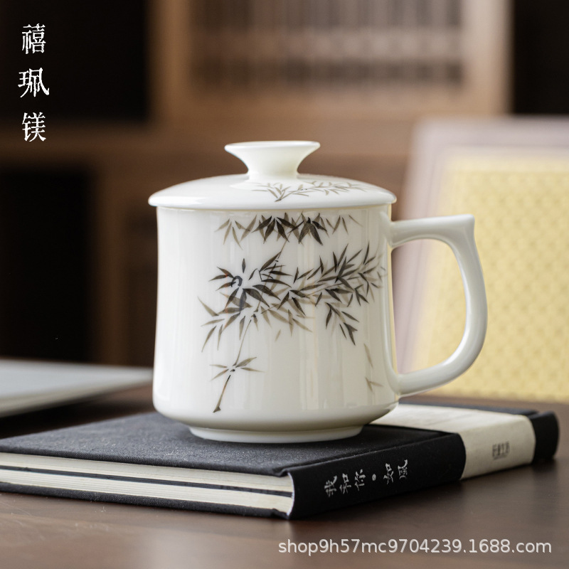 禧マグネシウム手描き墨竹陶磁器杯ホテル会議事務室ビジネスプレゼントlogo蓋付きコップ