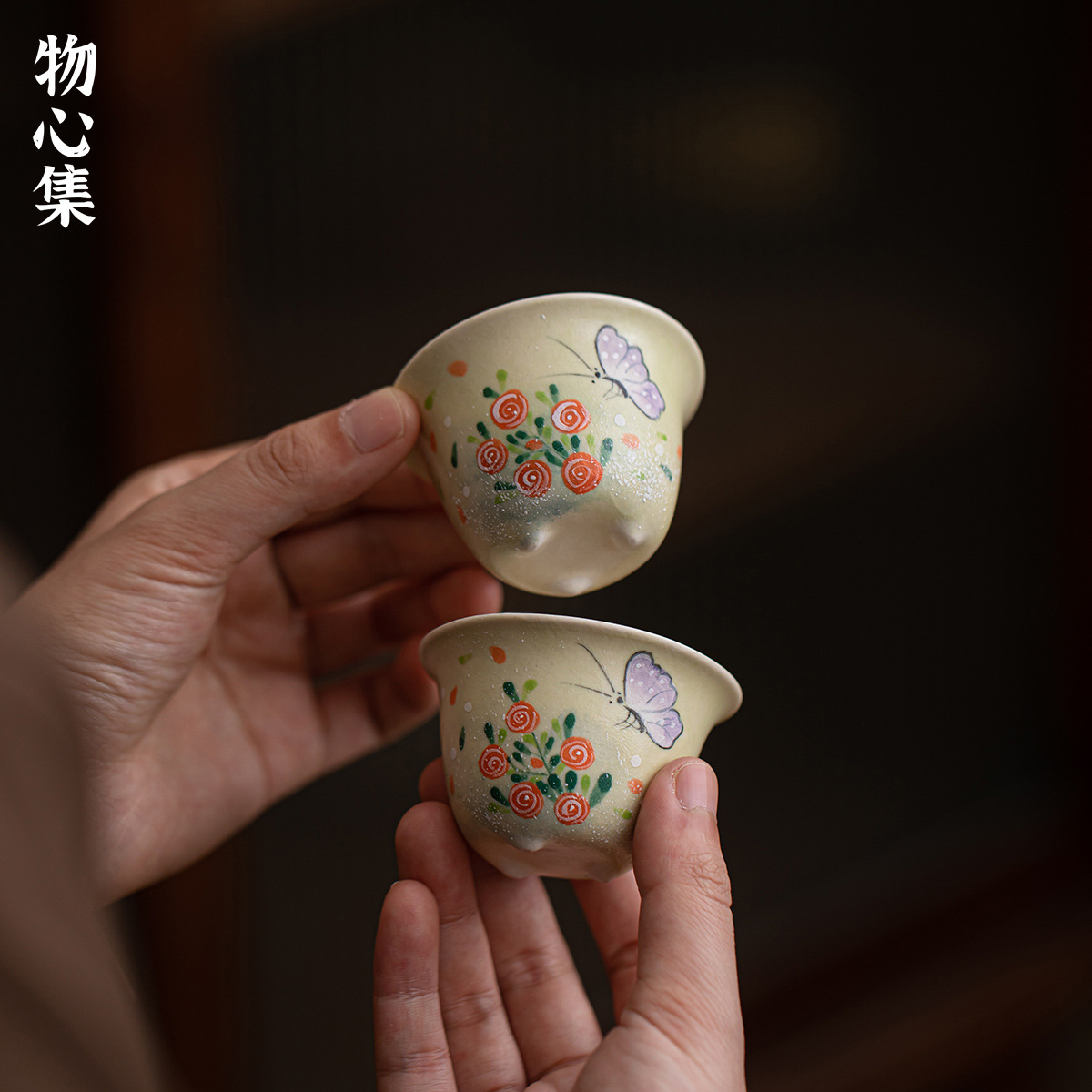 Wuxinji パウダーリング手描きの香りのよい蝶クリエイティブ三脚ティーカップセラミックティーカンフーティーセットパーソナルシングルカップ