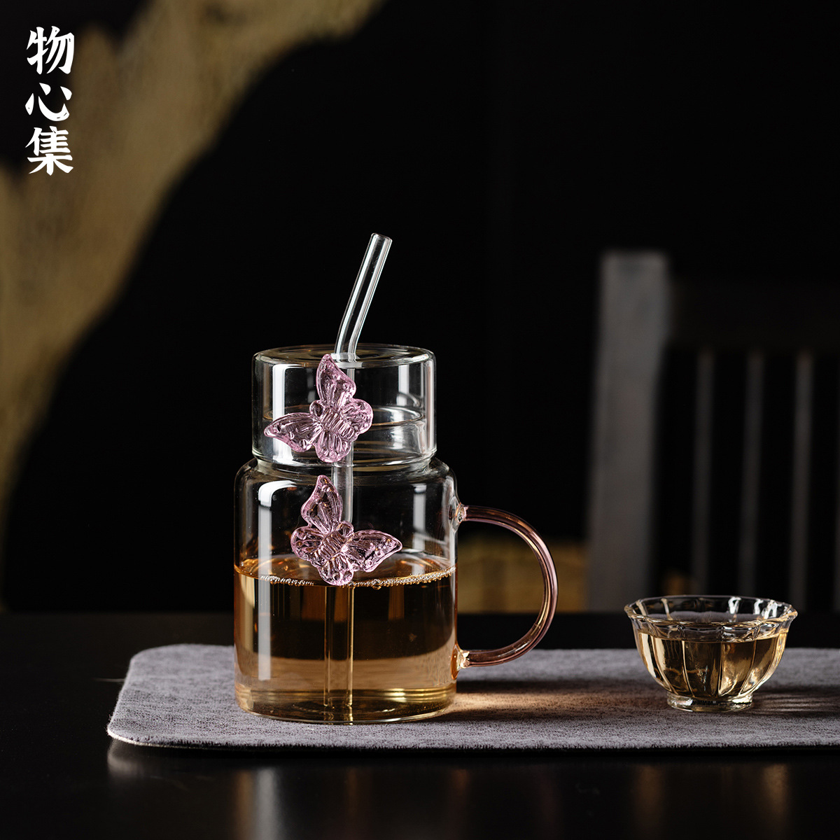 Wuxinji インターネットセレブピンクバタフライティーポットガールガラスハンドル付き高ホウケイ酸ストローカップ水カップジュースカップティーカップ