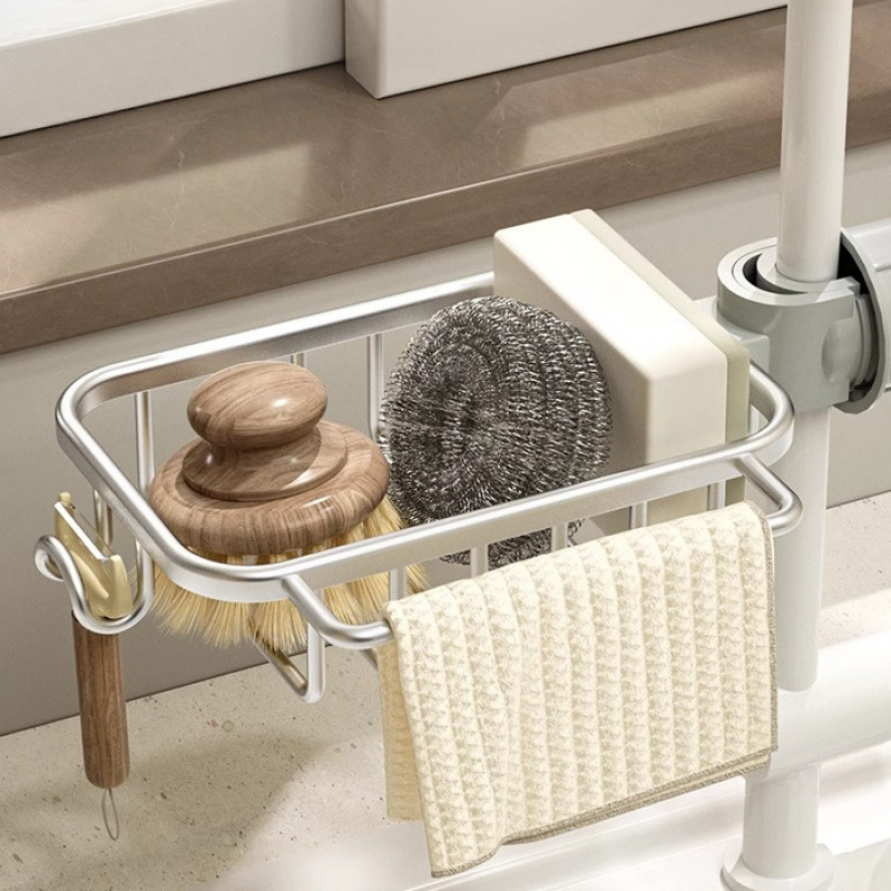台所の蛇口の物置棚の食器洗いの野菜を洗う池の水槽の棚の水たまりのかごの鋼のボールのスポンジの収納棚