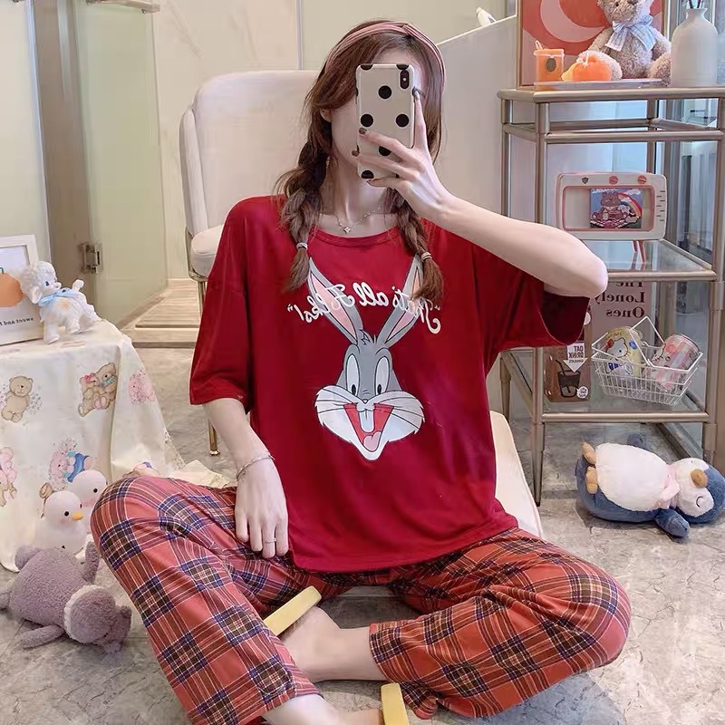 新しいパジャマの女性の夏の半袖のズボンの2つのセットのかわいいアニメのゆったりした大きいサイズの部屋の服のスーツは外で着ることができます。