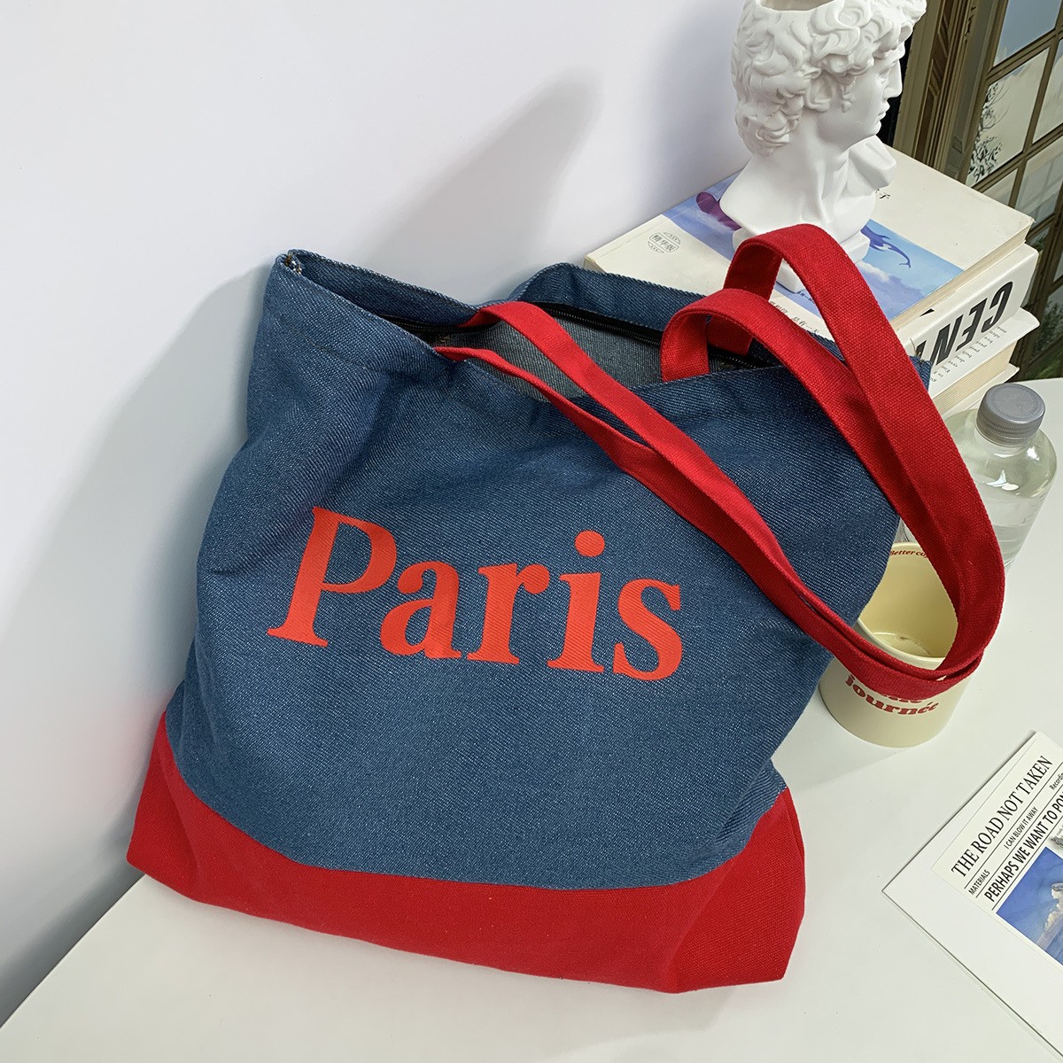 韓国版アルファベットプリントデニムキャンバスバッグショッピングバッグ手持ち現物トートバッグ大容量シンプルデニムバッグ