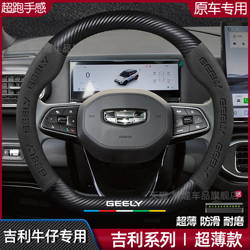 吉利デニムステアリングホイールカバー25モデルに適しています滑り止めカーボンファイバー本革オールシーズンユニバーサルスエードレザーハンドルバーカバー