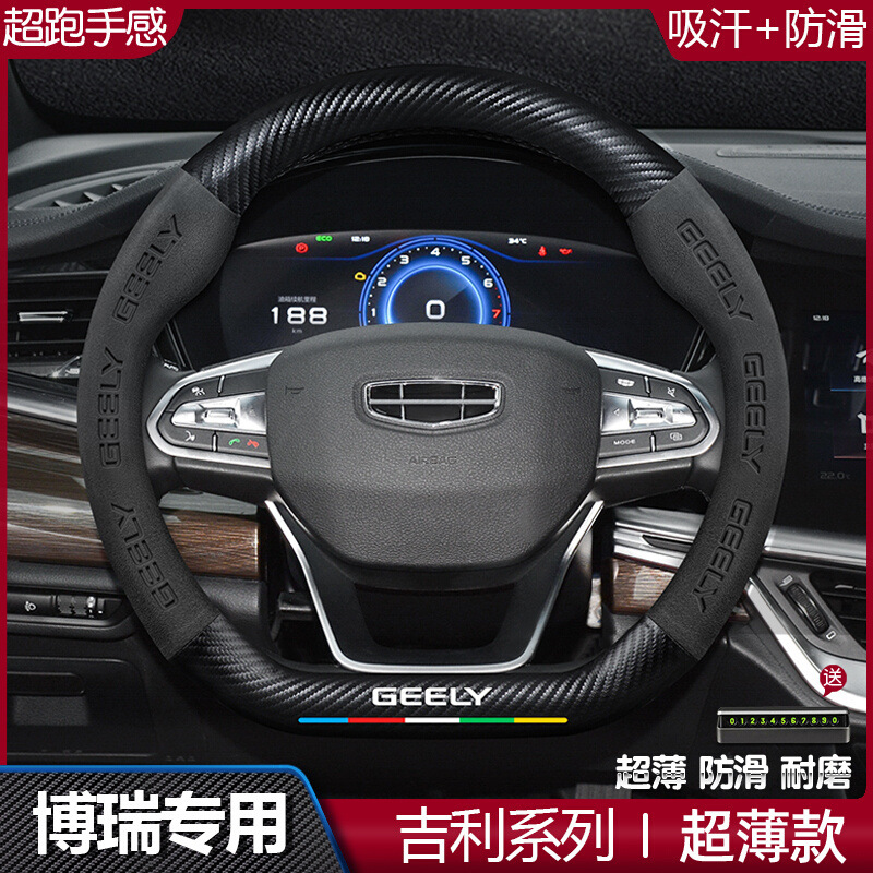 吉利ボレイステアリングホイールカバー 15-22 オールシーズン汎用スエードレザーカーボンファイバーハンドルバーカバーに適しています。