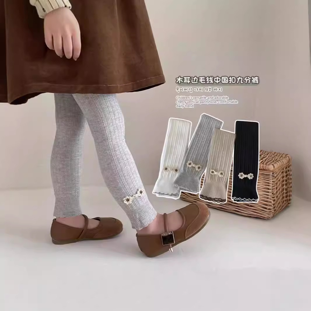2024秋の新しい子供用靴下卸売りの女の子のレギンスの精練綿の耳元の靴下の純色の子供の9分のズボン