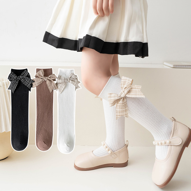 子供の足の靴下の双針の春と秋の学院の風の中で筒の靴下は綿の女の子の格子の蝶結びの靴下と甘いです。