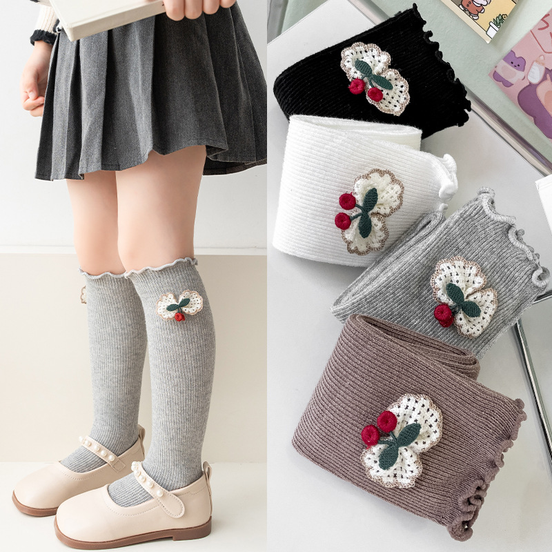 新しい子供の靴下春秋木の耳元の立体のさくらんぼの積み重ねの靴下の精練の綿の女の子の足の靴下の純色の中で靴下