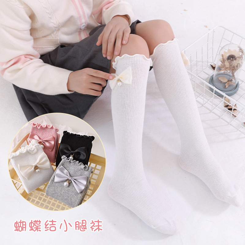 女の子の木の耳元の韓国版春秋の大きい真珠の蝶結びのロリータの王女のストレートの靴下の精練する綿の中の筒の靴下