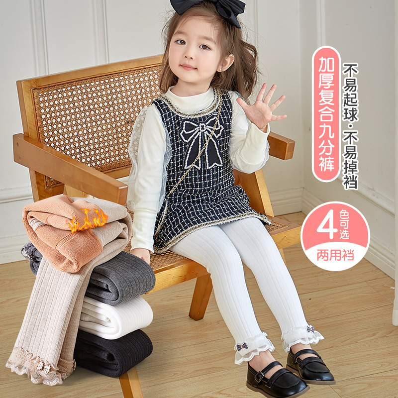 赤ちゃんの蝶結びのレギンスは冬にベルベットを厚くして、赤ちゃんの開段複合九分ズボンのレースのズボンの子供の綿を厚くします。