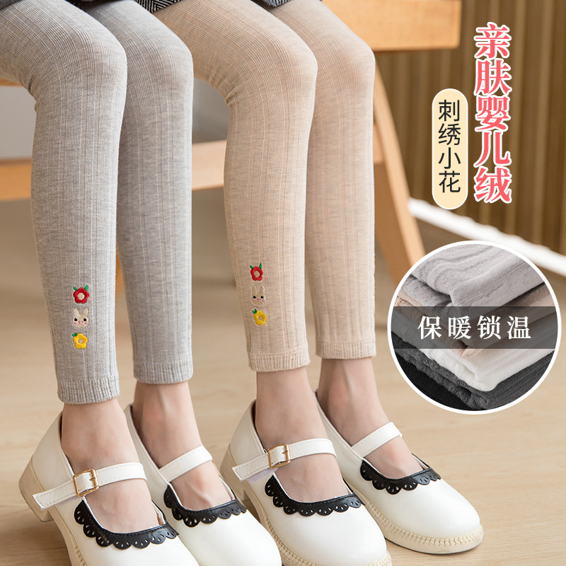 女の子の綿の毛を磨いて底のズボンの外で新型の秋冬のベルベットを着て刺繍の小さい花の子供の綿の高い腰を厚くしてかわいいです。