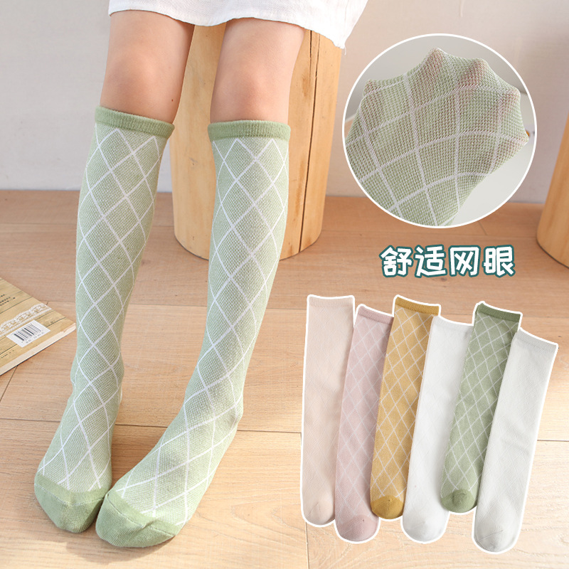 2022春の新型菱の目の子供の中筒の靴下のキャンディー色の女の子の綿の靴下の中で靴下を積みます。