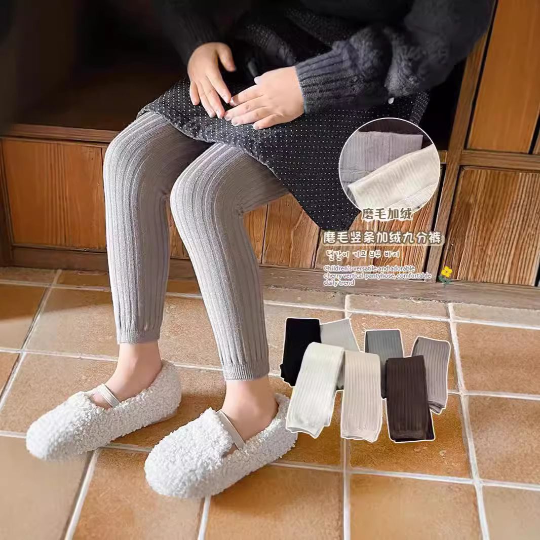 2024秋冬の薄い子供のズボンの靴下の保温は毛の女の子を磨いてズボンの純色の縦条を打って合わせます。