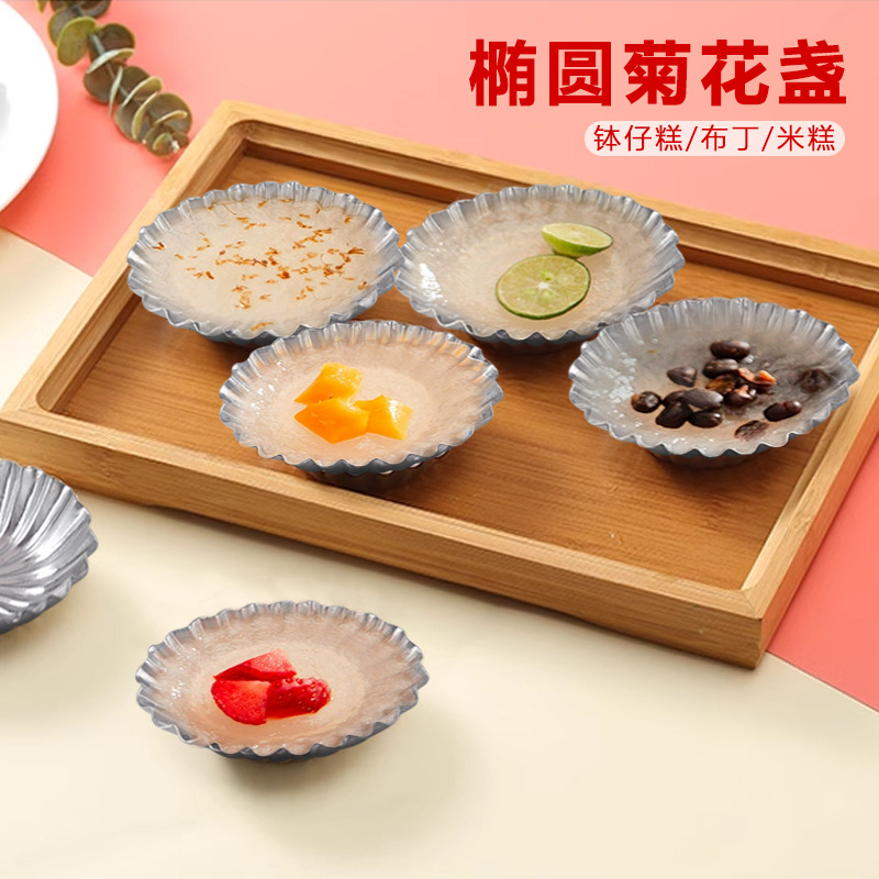 丸い菊の杯を厚くして、アルミ合金の卵の型の米餅を使って鉢の子餅を蒸してケーキの型を焼きます。