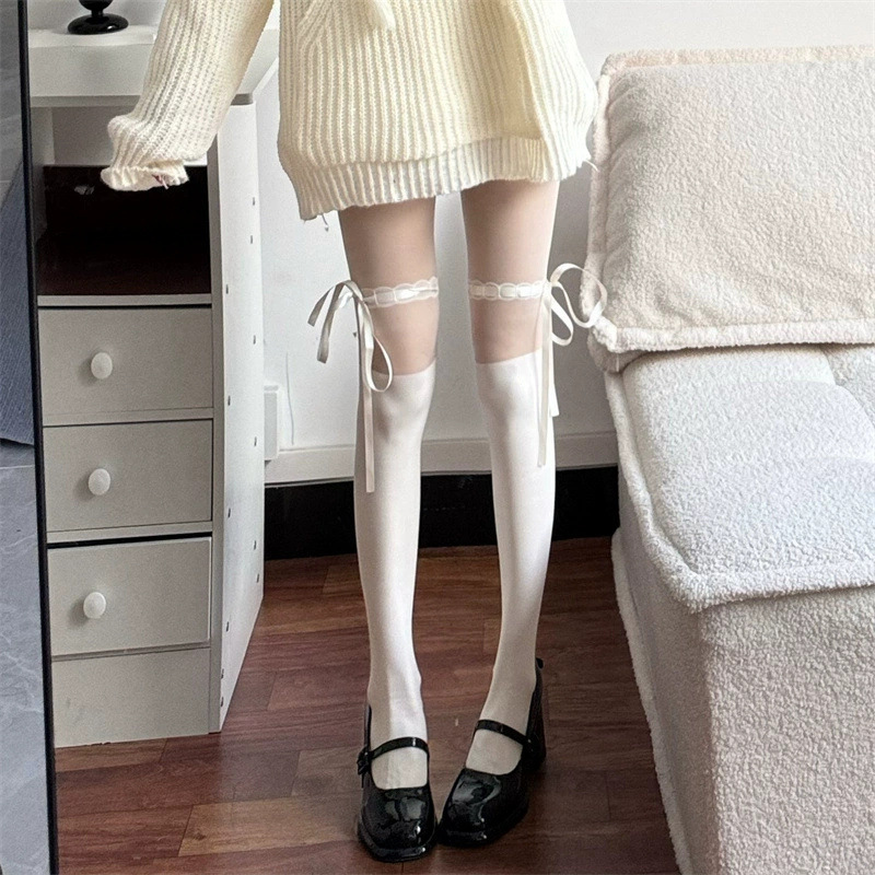 リボン付きシルクストッキング、乳白色のスプライシングパンスト、女性用薄いロリータホットガール黒シルク痩身ボトムソックス