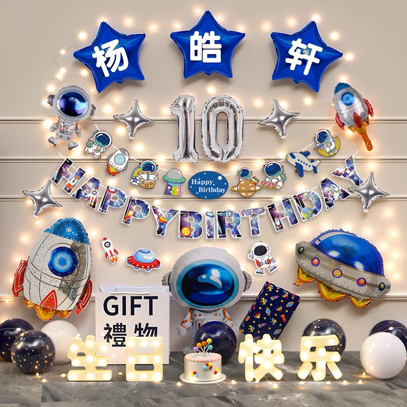 男の子の10歳の子供の子供の歳の男の子の誕生日の背景の壁の装飾の風船の雰囲気感の道のシーンの配置を思います。