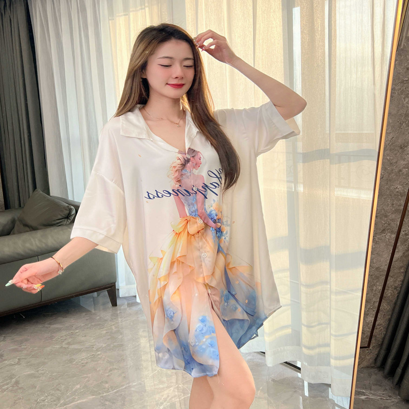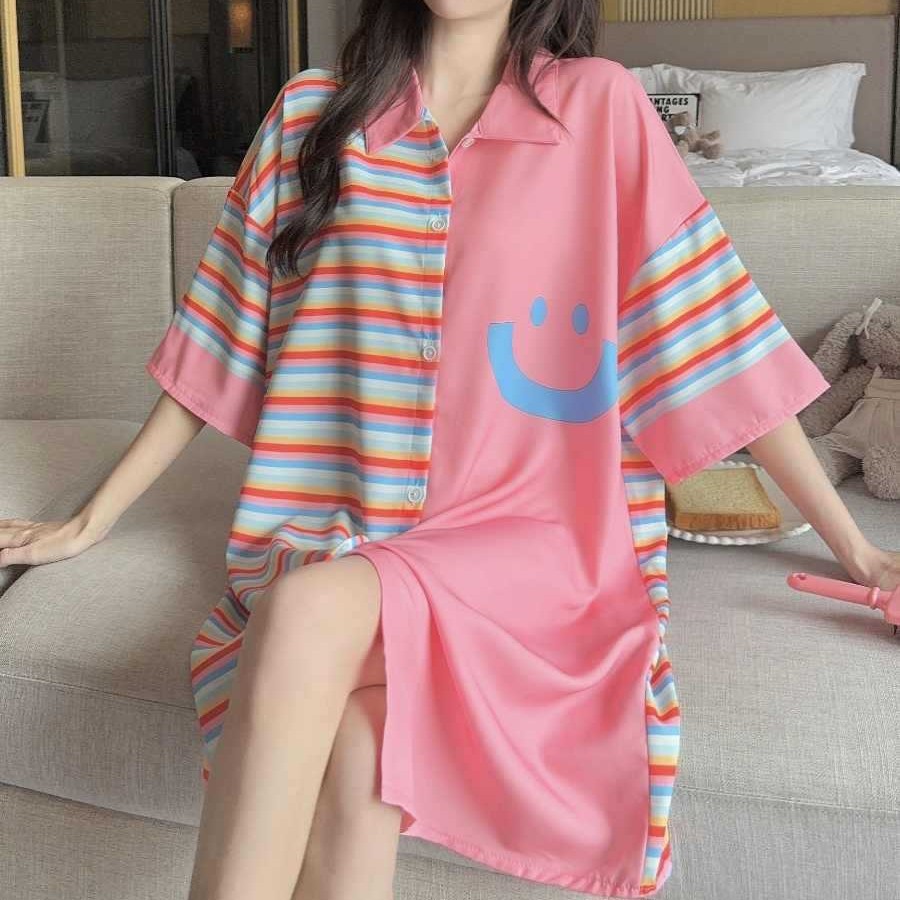 彼氏風パジャマ女性夏の薄い氷糸はシャツのスカートを着ることができます。