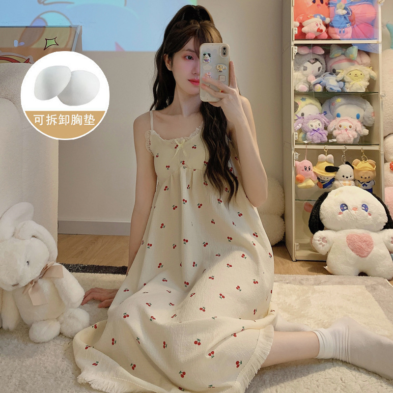 ストラップ付きのパジャマは胸パッド付きです。夏の純綿ネットは甘くて可愛いお姫様風のパジャマです。